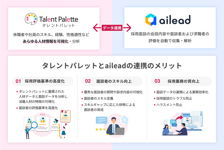 また、aileadからの連携データとタレントパレットに蓄積されたスキル、適性検査、評価結果をかけ合わせて分析することで、自社で活躍している人材の面談時の特徴との比較により、面談者の評価基準の高度化を実現します。また求職者を惹きつける面談者の特徴をタレントパレット上で研修コンテンツとして提供することで、面談者の育成にも貢献します。