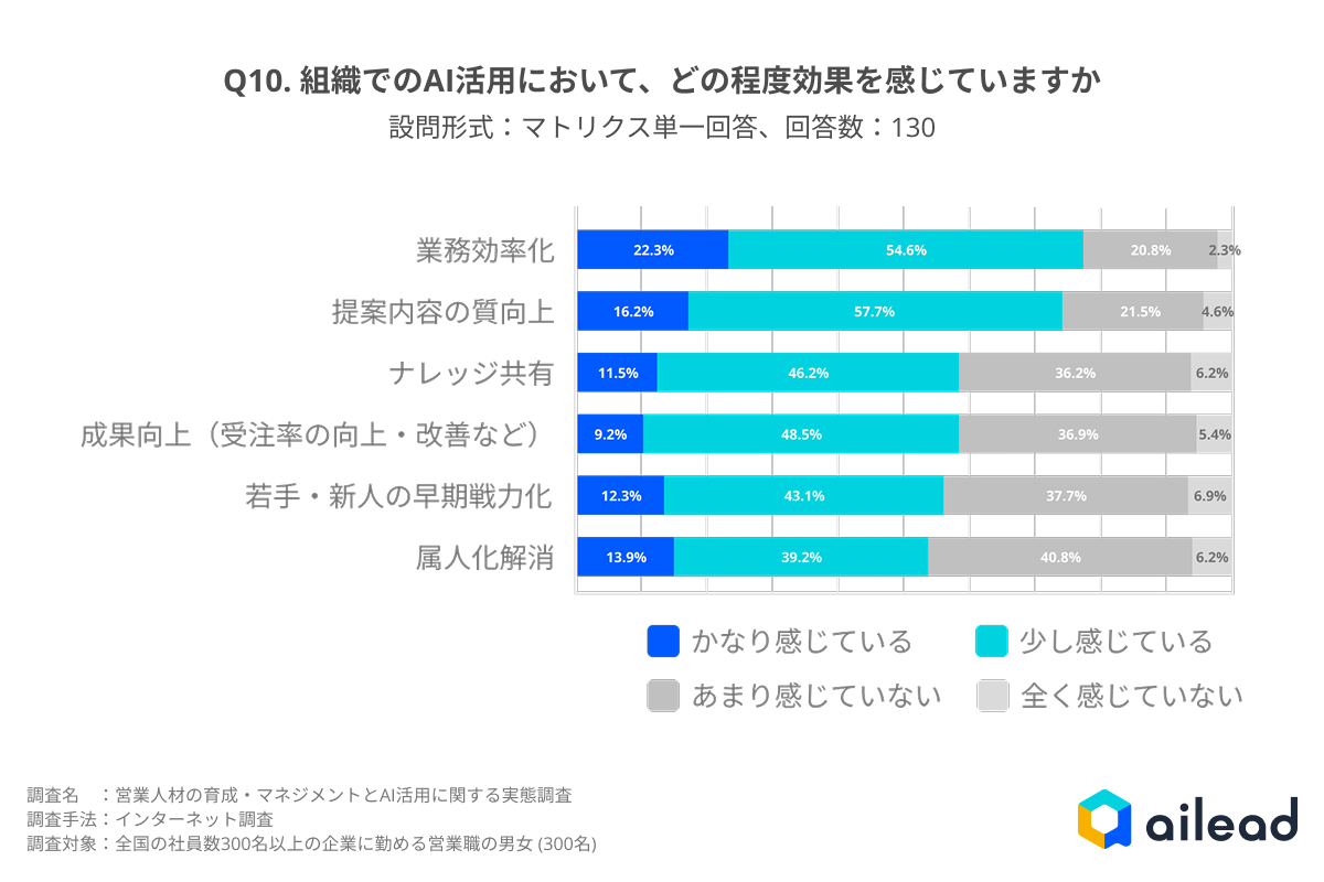 - 調査期間:2025年10月10日〜16日 ※本調査データを引用・掲載される際は、調査名「営業人材の育成・マネジメントとAI活用に関する実態調査(2025年)」および調査元「ailead」を明記ください。