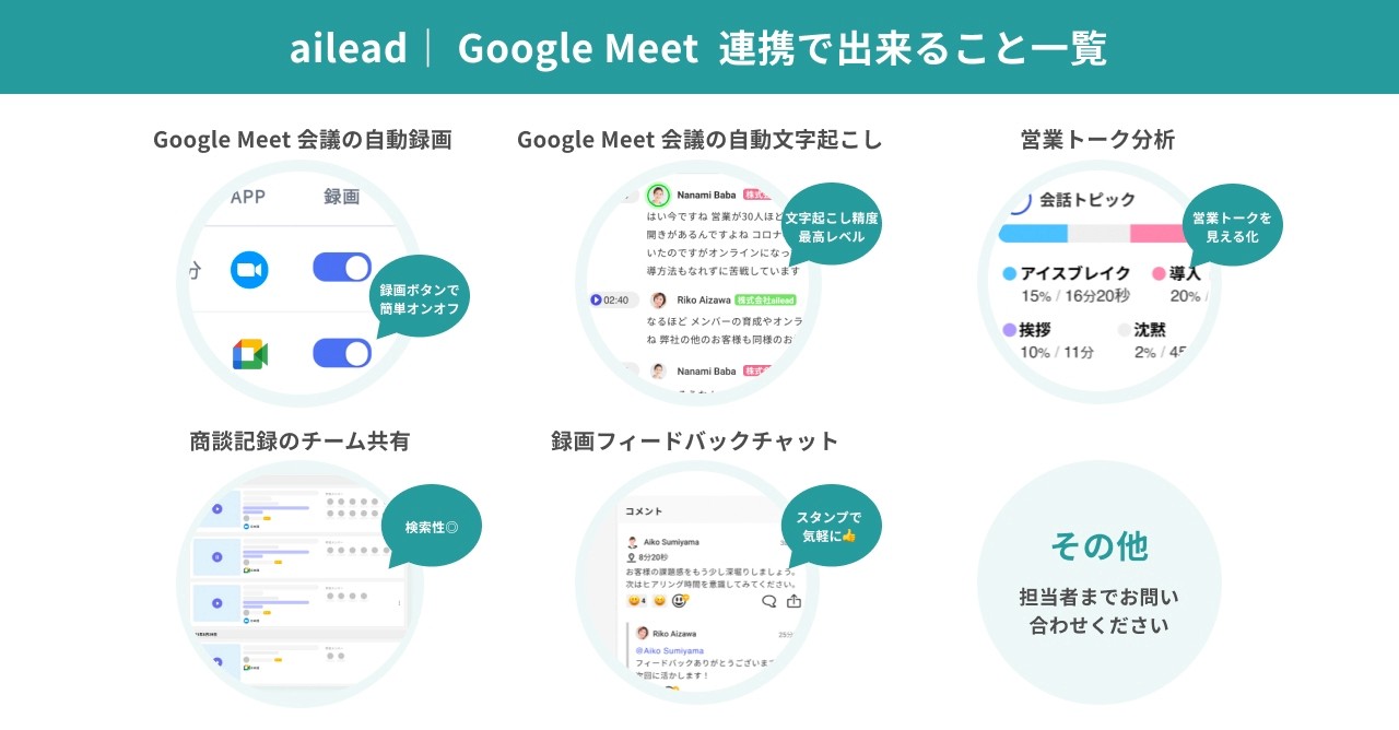 AIオートメーション技術を軸にグローバルで事業展開を行う株式会社ailead(本社:東京都港区、代表取締役:杉山大幹、以下ailead)は、提供中のWeb会議記録・分析クラウド「ailead(エーアイリード)」において、 Google Meet との連携を開始しました。この連携により、ailead上で Google Meet を含む複数のWeb会議ツールの一元管理が可能になるとともに、 Google Meet でのWeb会議にaileadの各種機能をご活用いただくことで、営業組織におけるセールス・イネーブルメントの構築を目指します。