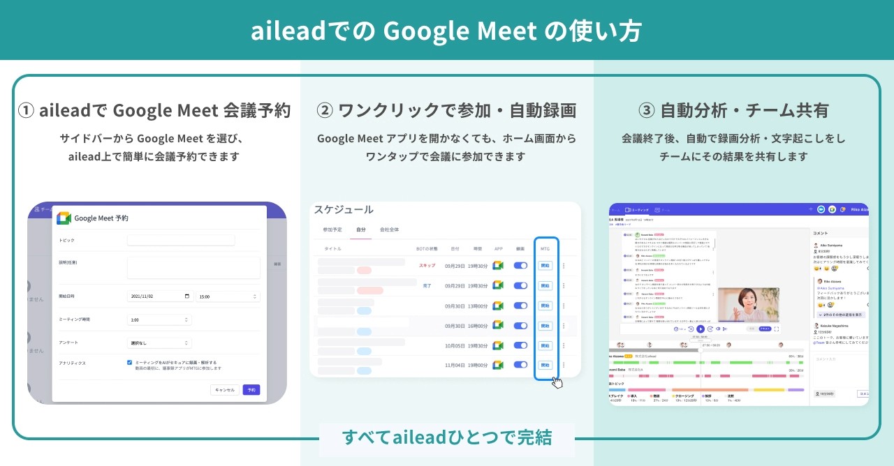 1ailead上で Google Meet 会議をスケジュール、URLを発行できます 2ailead上から、 Google Meet 会議に参加できます 3会議終了後、自動で文字起こしや分析・記録共有が行われます
