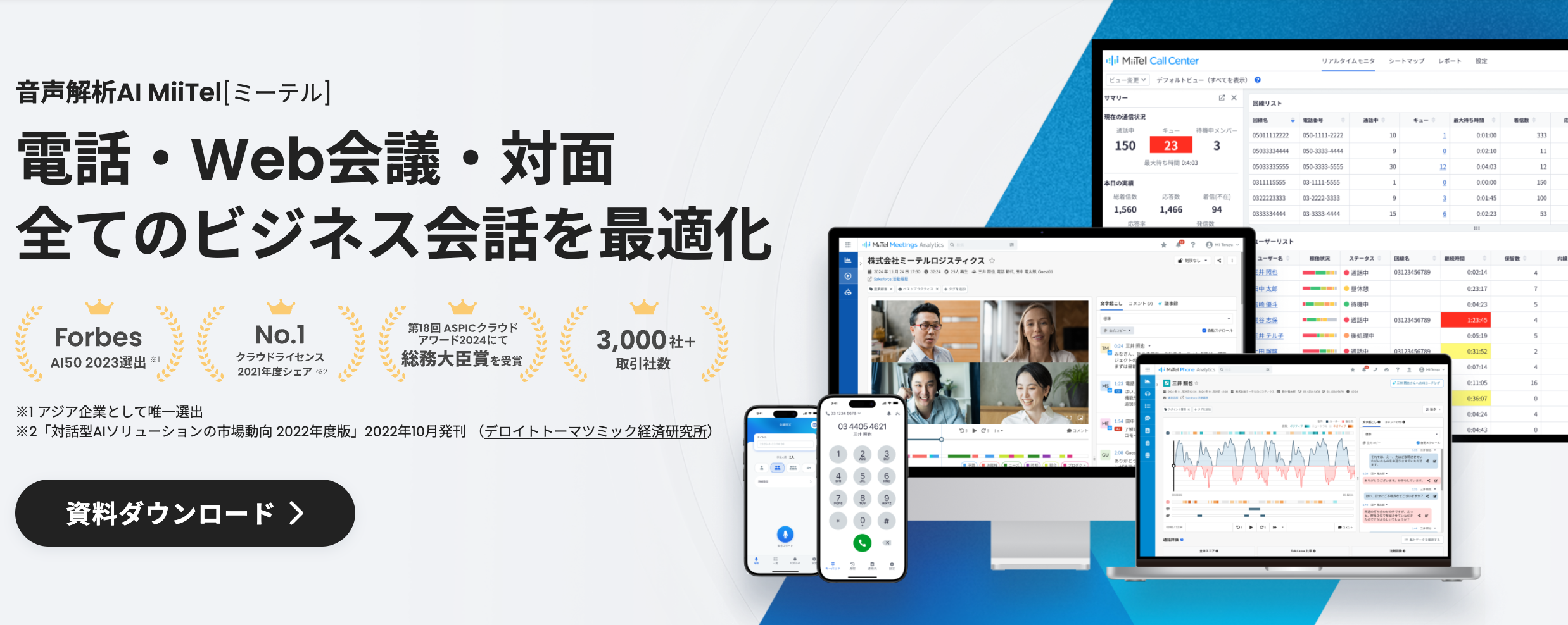 MiiTelは、音声解析AIを搭載した電話・商談解析ツールです。オンライン商談・電話・対面など複数チャネルに対応しており、会話内容をリアルタイムで文字起こし・スコアリングします。通話品質や顧客対応スキルを定量的に可視化でき、コールセンターや営業部門で広く導入されています。 https://miitel.com/jp/