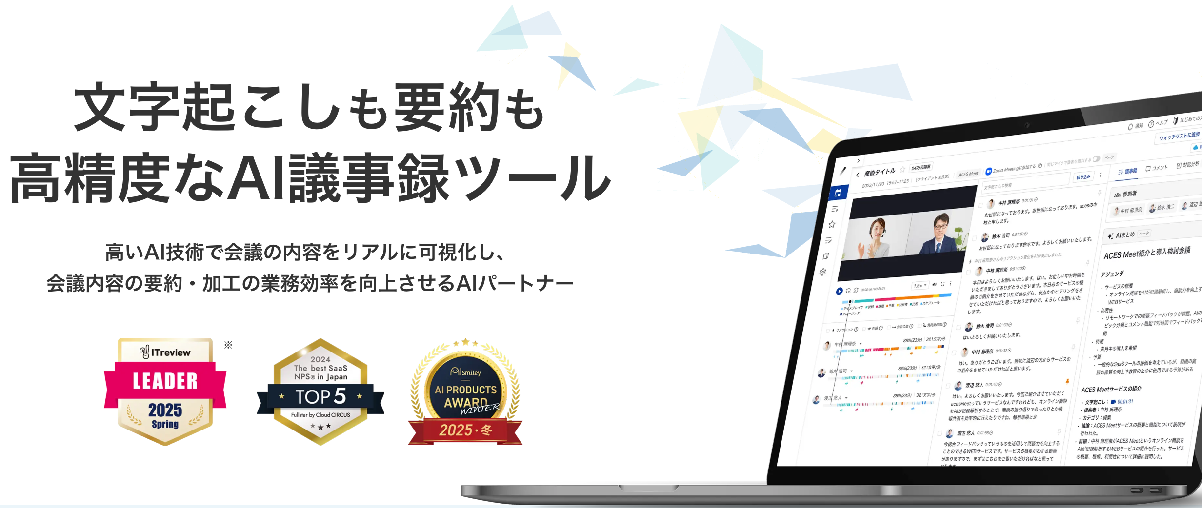 ACES Meetは、オンライン商談や会議を自動で録画・文字起こし・要約できる商談解析ツールです。Zoom、Google Meet、Microsoft Teamsなど主要な会議ツールと連携し、発言者ごとの話量やトピックをAIが分析します。議事録作成や報告書作成の負担を軽減し、商談の振り返りや育成を効率化します。 https://meet.acesinc.co.jp/
