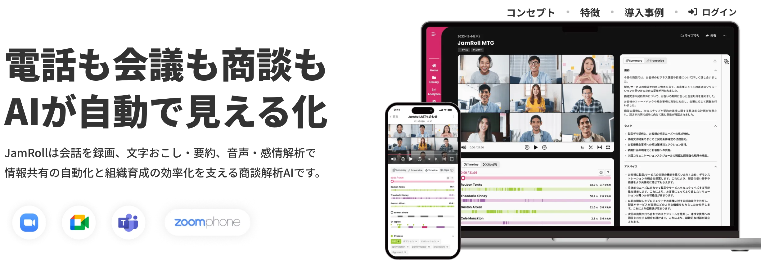 ナレッジワークAI商談記録(旧JamRoll)は、会議や商談の録画・文字起こし・要約に加えて、音声感情解析を行えるAI会話分析ツールです。電話・会議・商談など複数の会話チャネルを横断して分析でき、話し方や顧客反応などを視覚的に確認できます。 https://jamroll.poetics-ai.com/