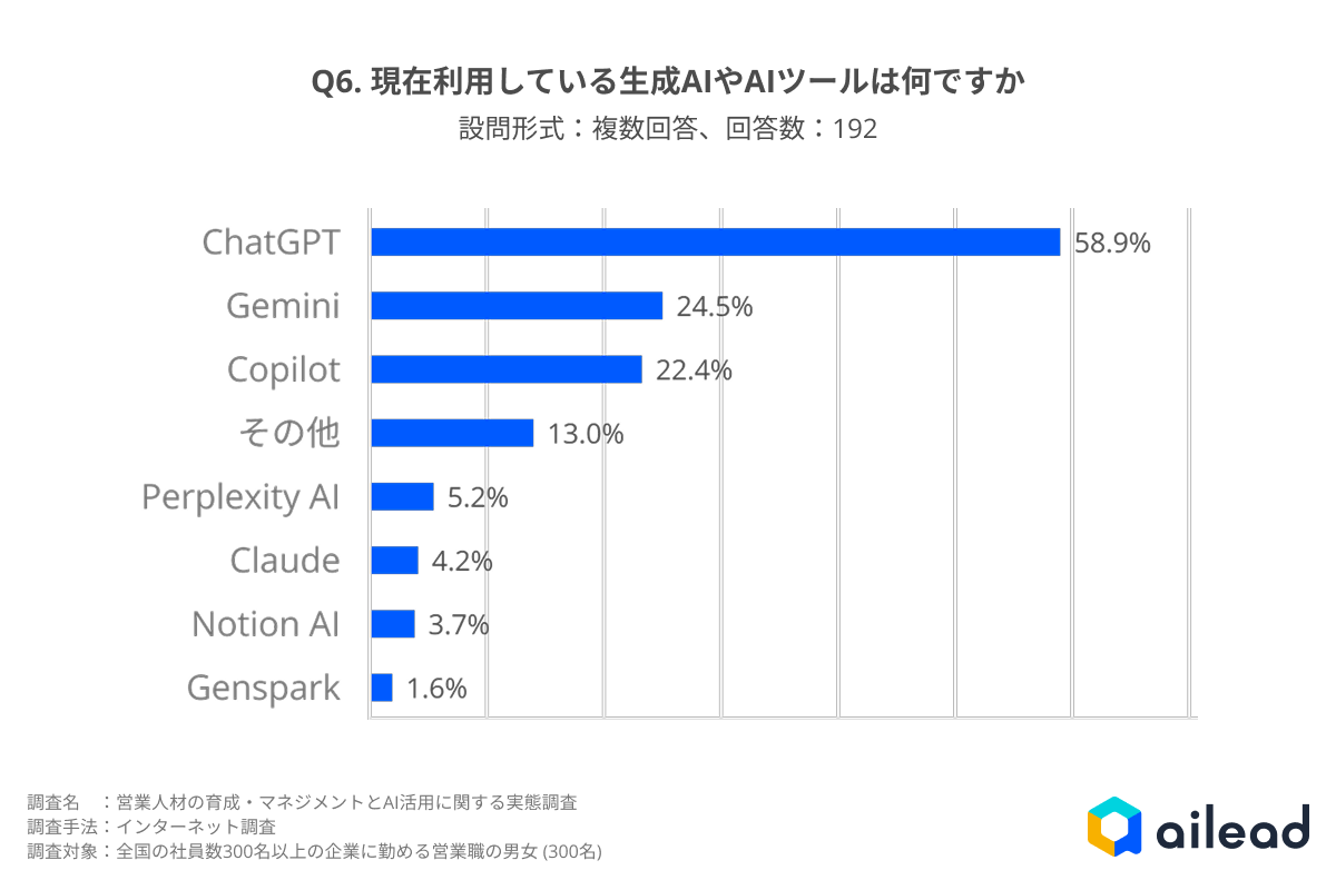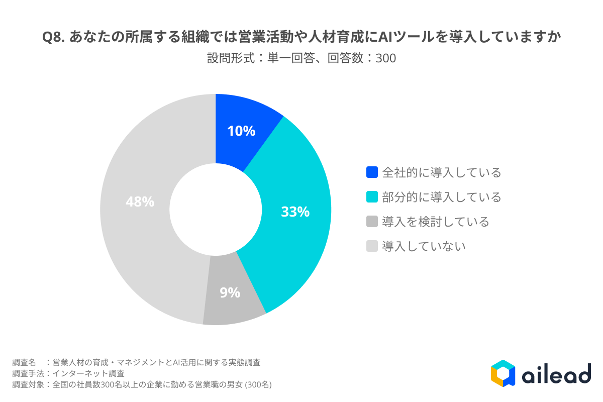 - 調査期間:2025年10月10日〜16日 ※本調査データを引用・掲載される際は、調査名「営業人材の育成・マネジメントとAI活用に関する実態調査(2025年)」および調査元「ailead」を明記ください。