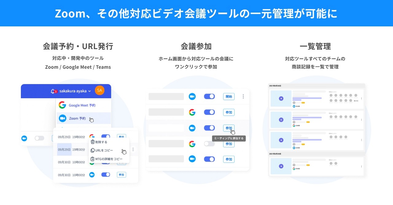 ・ailead上から対応ツールすべての会議予約、URL発行 ・ailead上から対応ツールすべてのビデオ会議参加 ・対応ツールすべての会議記録をailead上で一覧管理