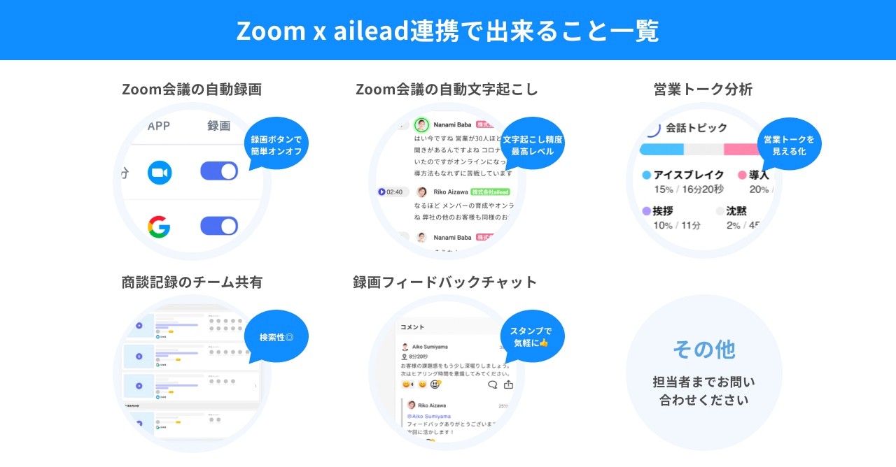 このようなリモートワーク時代の営業組織課題を解決し、組織全体の生産性を向上するため、aileadではこれまでビデオ会議の自動記録・共有・見える化、さらには商談録画を起点としたフィードバックコミュニケーションの活性化に貢献するサービスを提供してまいりました。