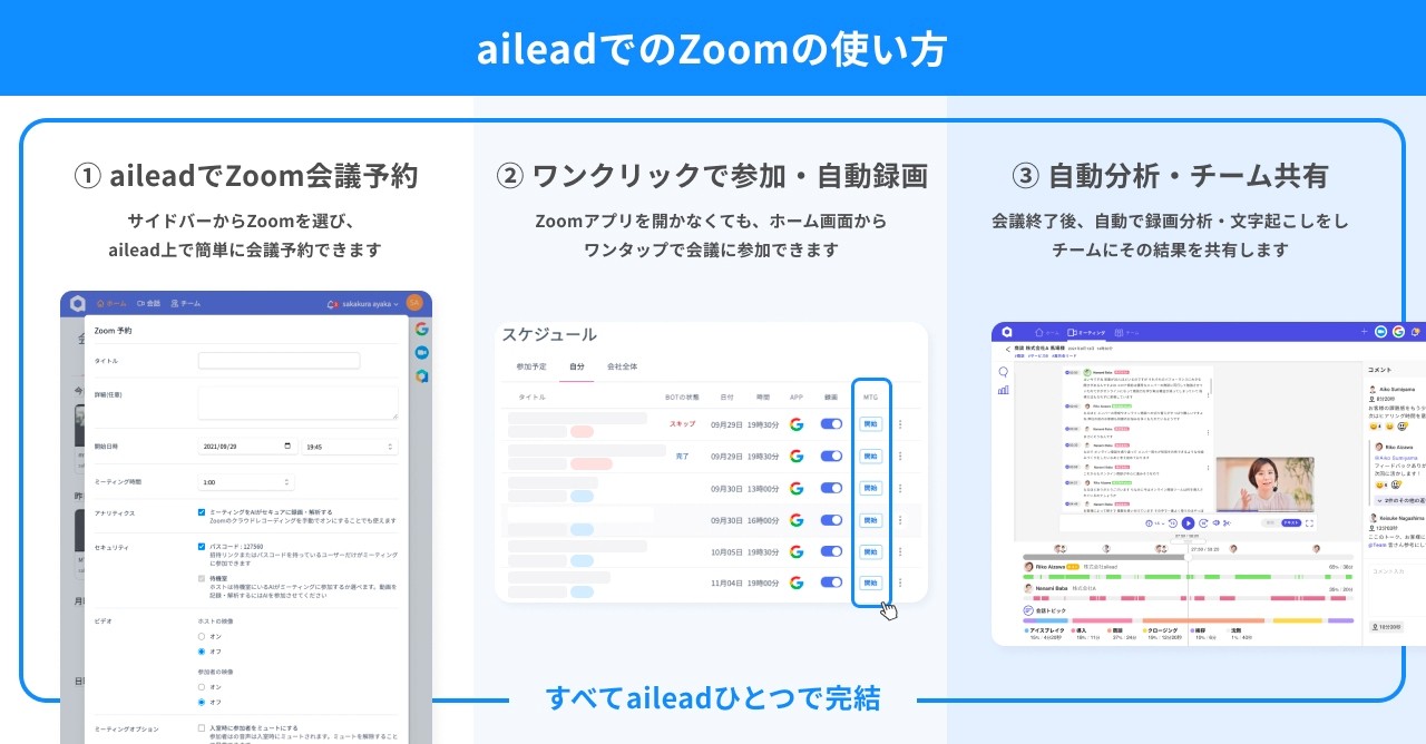 aileadでのZoomの使い方 ・ailead上でZoom会議をスケジュール、URLを発行できます ・ailead上から、Zoom会議に参加できます ・会議終了後、自動で文字起こしや分析・記録共有が行われます