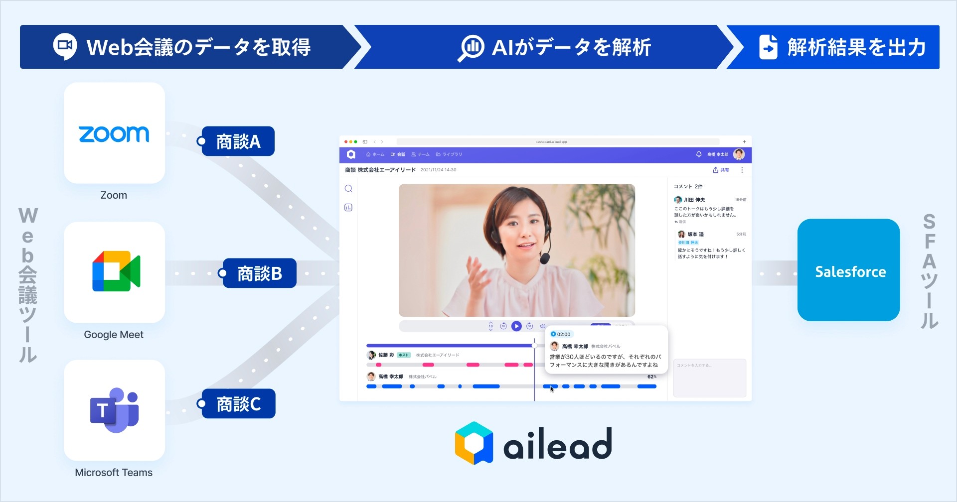 商談解析クラウド「ailead(エーアイリード)」を提供する株式会社ailead(本社:東京都港区、代表取締役:杉山大幹、以下ailead)は、Salesforceとの連携を開始したことをお知らせ致します。Web会議のデータから参加者や日時等の記録に必要な情報を自動取得することで、Salesforceの商談記録への自動入力が可能となります。営業パーソンの記録業務の工数削減により、営業組織における生産性の向上を目指します。